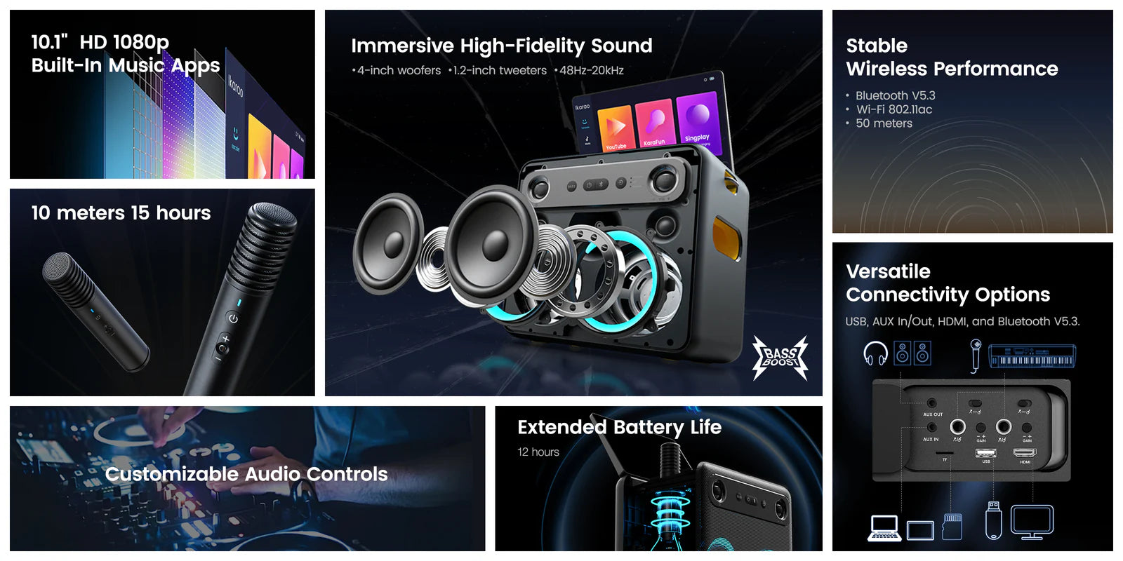 Der Break X2 ist dein kreativer Partner mit einem 10,1-Zoll-HD-Touchscreen. Das LCD-IPS-Display mit einer Auflösung von 800P bietet gestochen scharfe Bilder und eine intuitive Bedienung. Installiere Apps wie Karafun, Spotify oder Smule und entdecke eine Welt voller Musik- und Karaoke-Spaß. Bereit, dein Publikum zu begeistern?