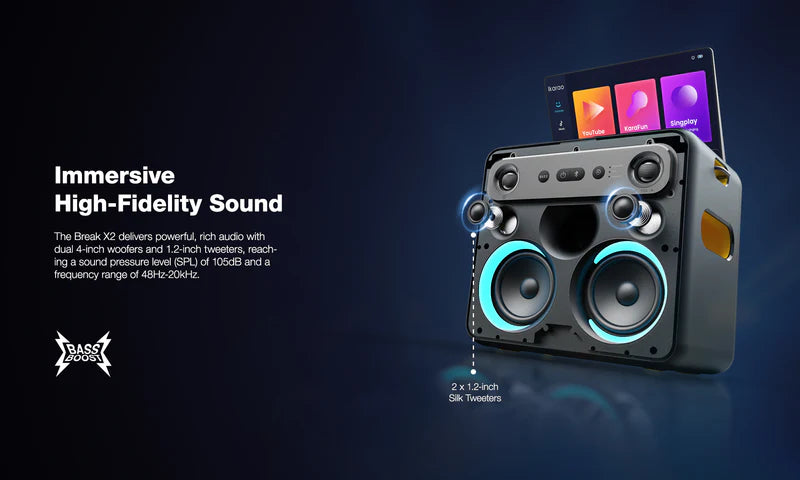 Machine audio sans fil portable Break X2 Premium, deux woofers de 4 pouces et écran HD de 10,1 pouces