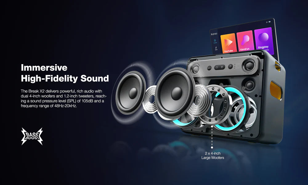 Avec l'Ikarao Break X2, vous bénéficiez d'un son comme jamais auparavant. Équipé de deux woofers de 4 pouces et de tweeters de 1,2 pouces, le Break X2 offre un équilibre parfait entre des basses puissantes et des aigus cristallins. Avec un niveau de pression acoustique de 105 dB et une plage de fréquences de 48 Hz à 20 kHz, vous aurez l'impression d'être au cœur d'un concert live. Idéal pour les fêtes, spectacles ou présentations.