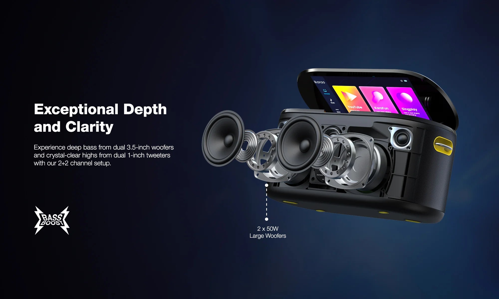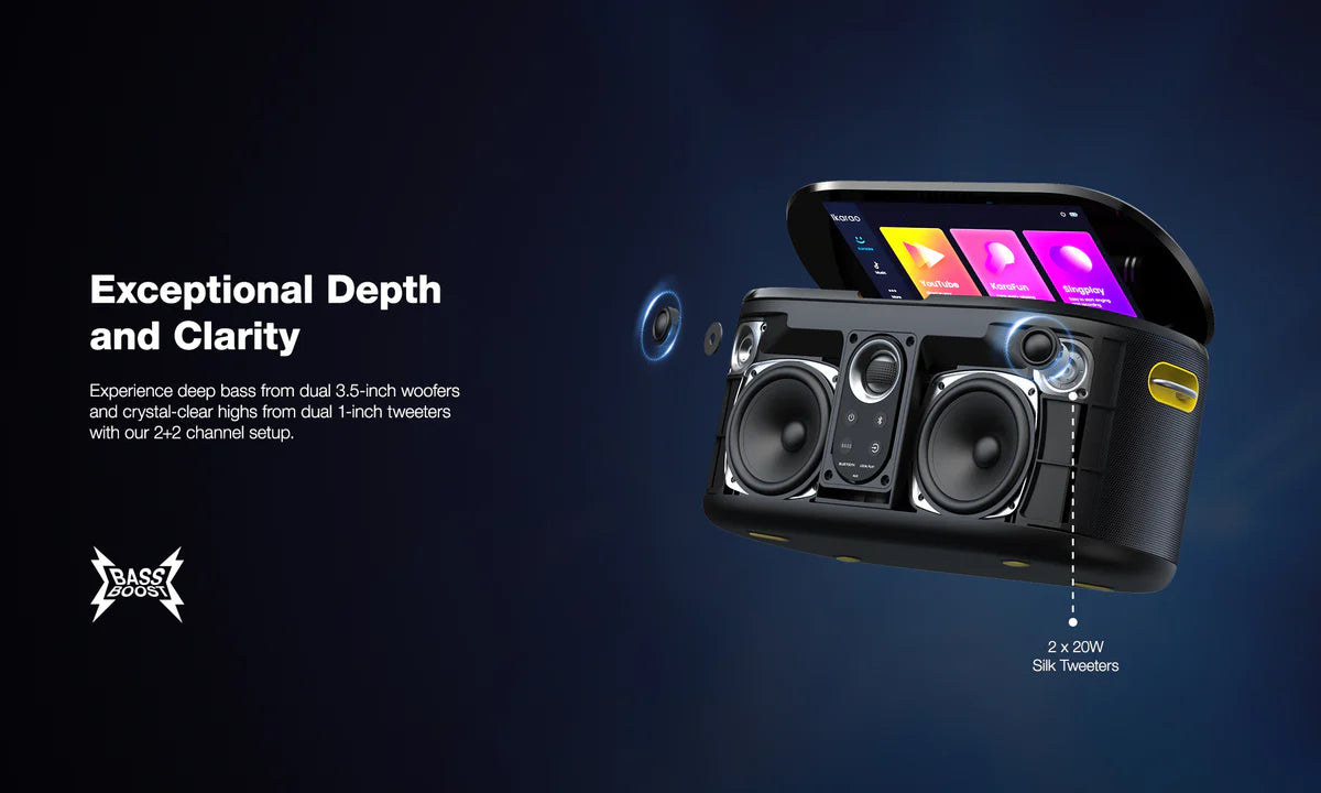L'écran tactile lumineux de 10,1 pouces rend tout plus facile et plus amusant. Que vous mettiez votre chanson de karaoké préférée ou que vous diffusiez de la musique via des applications comme Spotify et Karafun, l'écran répond rapidement et intuitivement. Vous vous sentirez instantanément comme un artiste professionnel avec cet assistant pratique à portée de main.