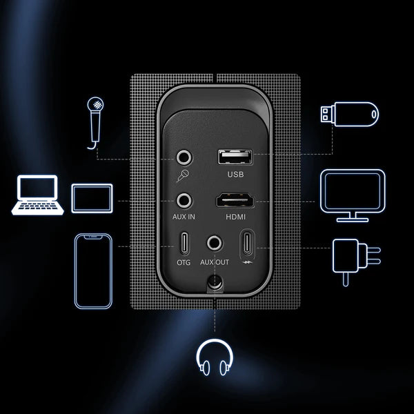 Connectez-vous facilement via USB, AUX In/Out, HDMI et Bluetooth V5.4. Que vous diffusiez de la musique, connectiez un microphone ou une guitare ou passiez d'un appareil à l'autre, l'Ikarao Shell S1 offre des transitions fluides pour toutes les occasions.